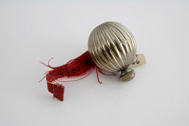 Måttband med fodral av försilvrad metall, melonformat med skruv för upprullning i ena ändan.