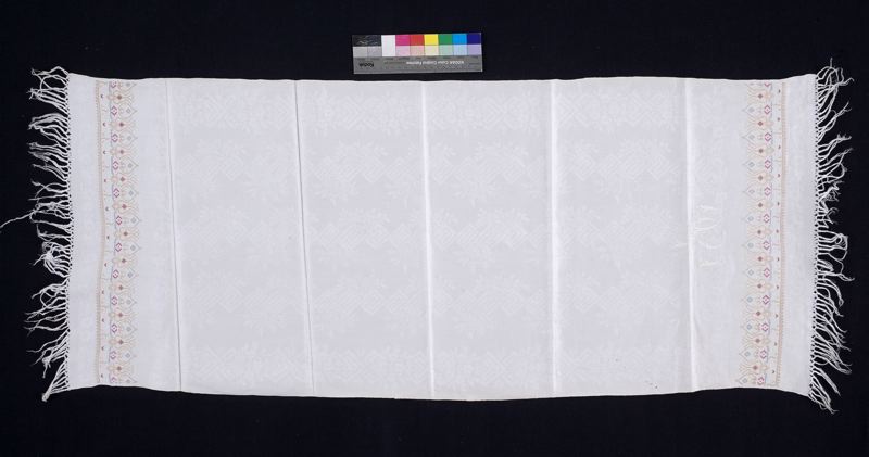 Duk av linnedamast med stramaljbundna bårder vid ändarna, broderade i korssöm med bomullsgarn. Märkta i plattsöm (G över A). Varpfrans.