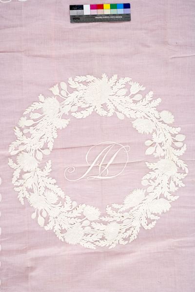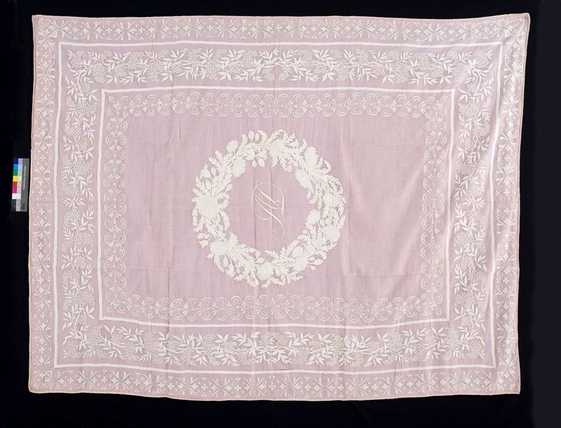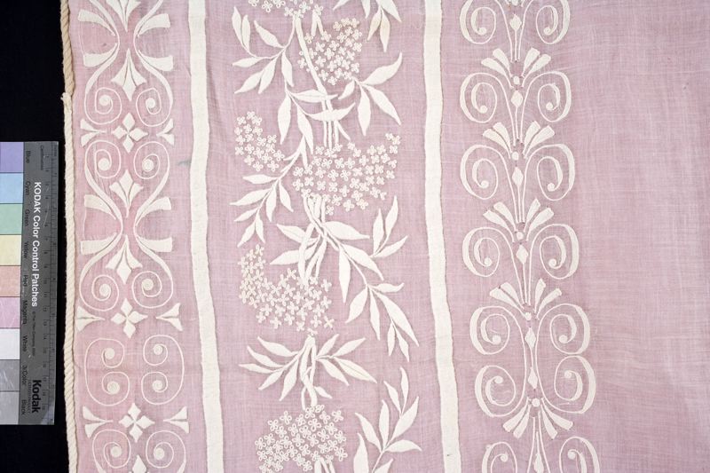 Sängöverkast av vit tunt bomullstyg broderat i plattsöm klumpsöm och
