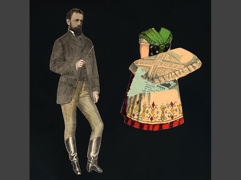 Pappersdocka. Herre med tidningspappers huvud. Svart litografiskt tryck