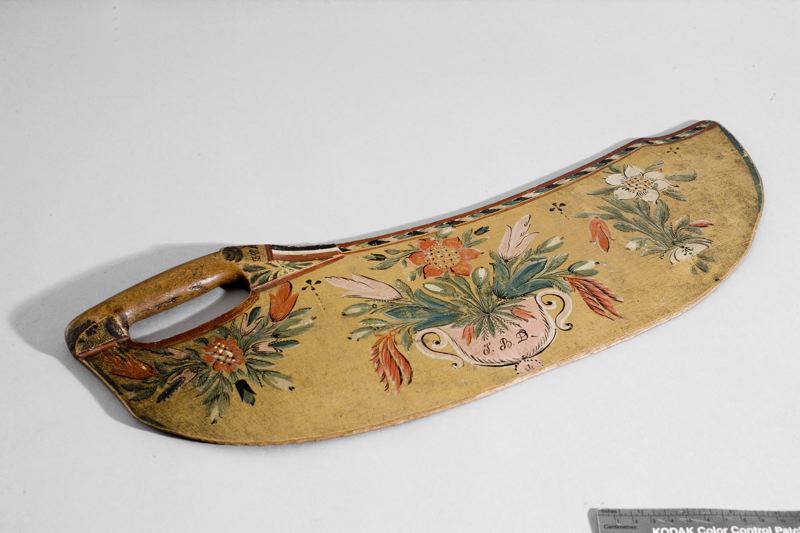 Skäkteträ av boke med snidat handtag målat med gul botten, skär vas med