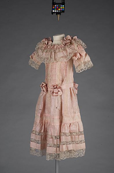 Slutbalsklänning (flicka 7 år) av skär taft överklädd med prickig vit silkegas. Garnerad med infällda spetsar och rosetter av skära ripsband.