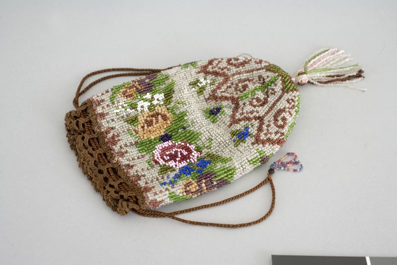 Väska, helt broderad med pärlor i färgerna skärt, grönt, rött två