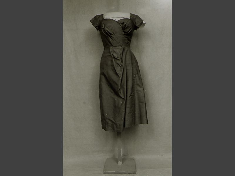 - Klänning av rosaskimrande helsiden med invävd effekttråd. Avskuren i midjan. Liv med låg hjärtformig urringning med gummiband för att hålla den på plats, kort isydd ärm, sneddraperingar över bysten; foder av vit taft, konstsiden. Kjol i 3 våder sydd i midjan med intagningar draperade i grupper med veck framtill. Blixtlås i ryggen.