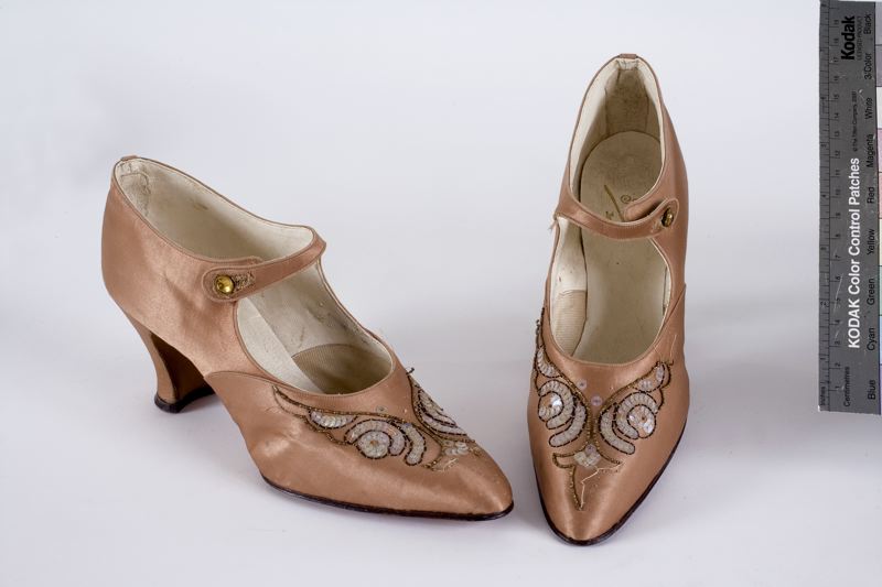 Damskor, 1 par. Av rosabeige siden med slejf. Paljettbroderi på tån, små