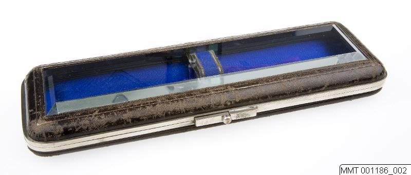 överklätt med svart skinn samt lock av glas. Foder av blått