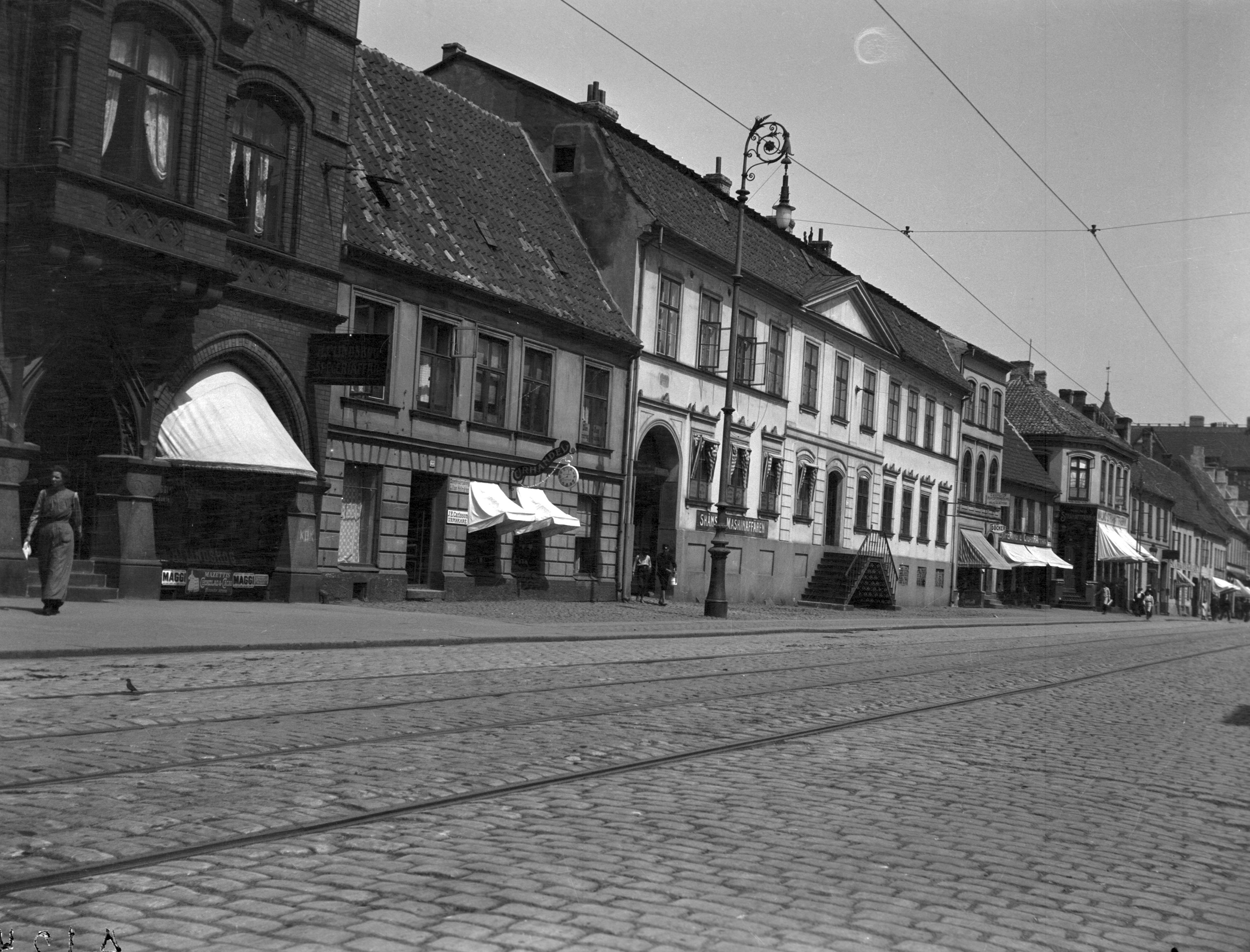 I bortre hörnan Malmö Stråhattfabrik i nr. 19. Sedan kommer då smala S:t Gertrudsgatan och därefter nr. 21-29 hitåt. Detta var de gamla husnumrena innan 1913. Så Kockumska huset som tidigare hade nummer 25, har här nummer 21.
