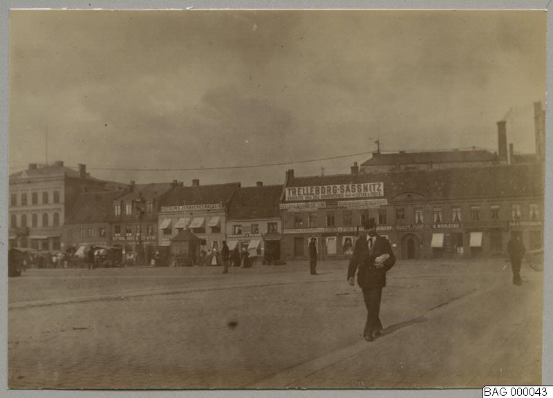 Till höger barberaren och handlaren Heinrich Wöhleckers ombyggda hus som gjordes på 1870-talet efter ritning av danske arkitekt Rasmussen. Fastigheten i kvarter nr. 40 Frans Suell köpte han av F. H. Kockums Tobaksfabriksaktiebolags sterbhus december 1875 för 80 000 kronor. De hade precis uppfört sitt nya komplex vid Västergatan. Till höger om man zoomar in kan man se hans rakstuga och handelsaffär fortfarande igång. Rak- och friserstugan längst till höger.