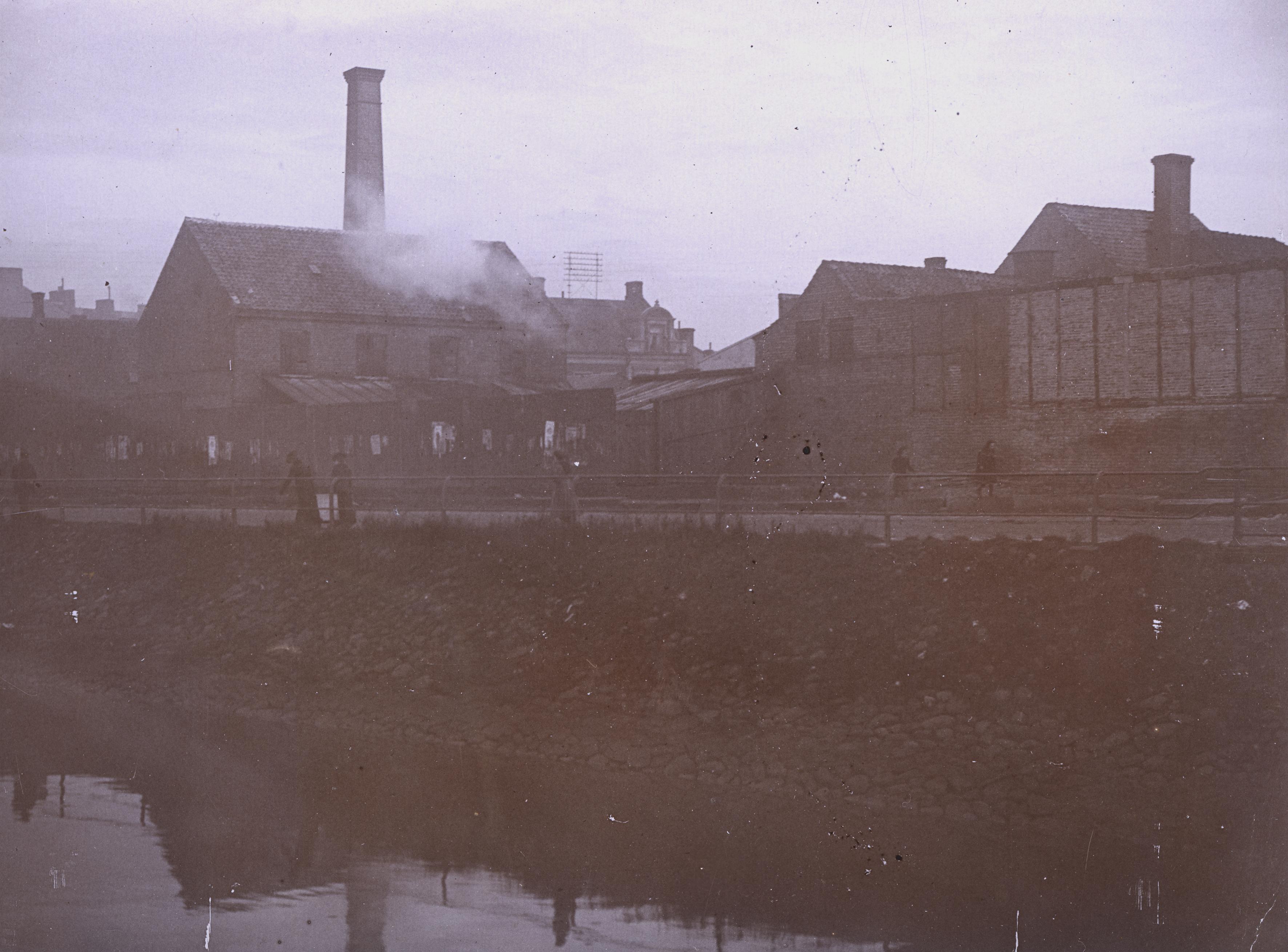 Norra Tvärgatan (nu Drottninggatan) längs kanalen, nära Davidhallsbron. Sedd från Södra Vallgatan. I bakgrunden fabrik, platsen för Malmkvistska bryggeriet innan det flyttade till Ystadvägen.