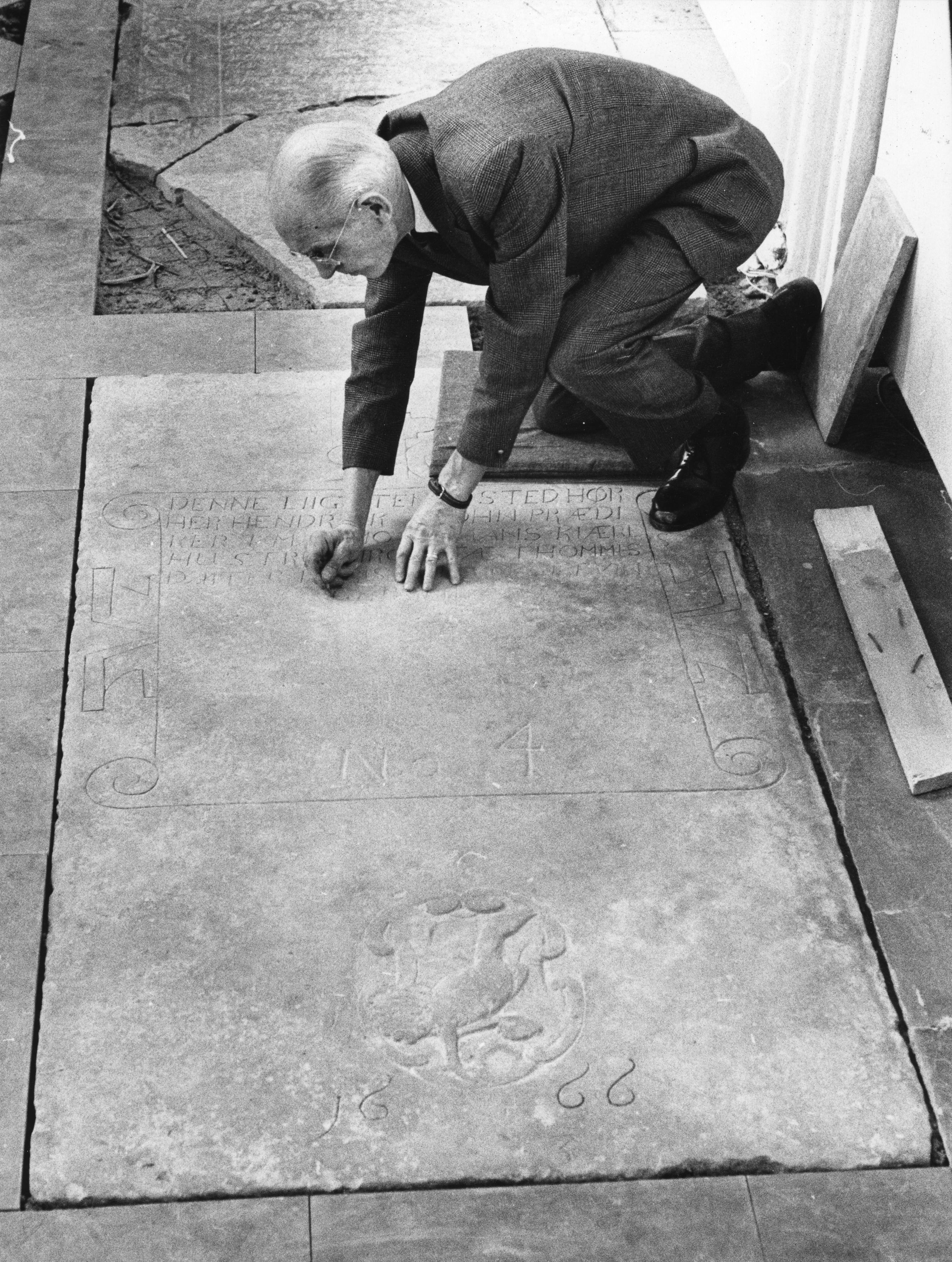 Einar Bager vid en gravsten i St. Petri kyrka 22 mars.