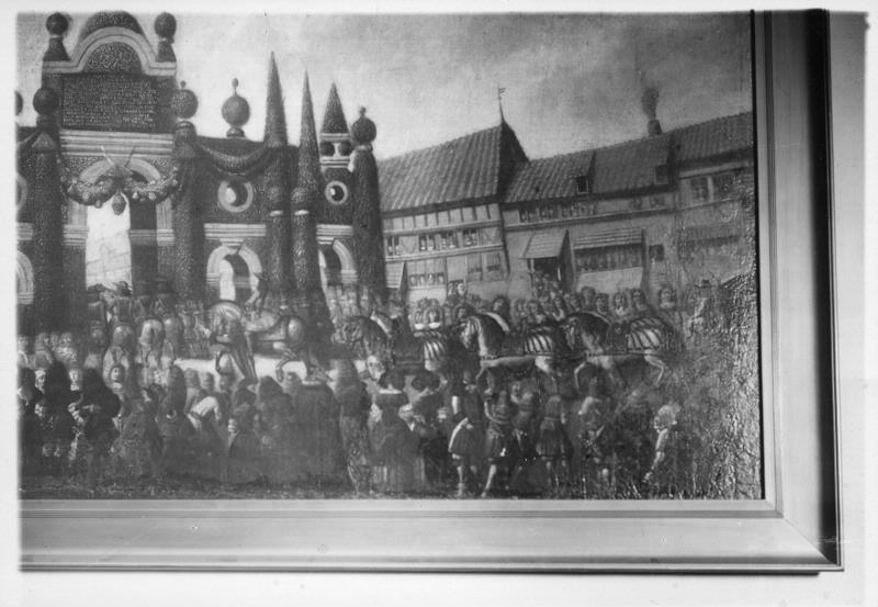 - Avfotograferad målning på Rådhuset, del. Bilden föreställer Karl XIs besök i Malmö 1673. Äreporten, till vänster i bild, restes på Östergatan och ritades av Erik Dahlberg. Målningen är troligen utförd av Christian Christiansen (d. 1686).