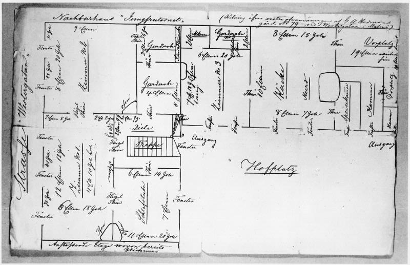 Ritning av interiör i Hedmanska huset nr 79 Westergatan