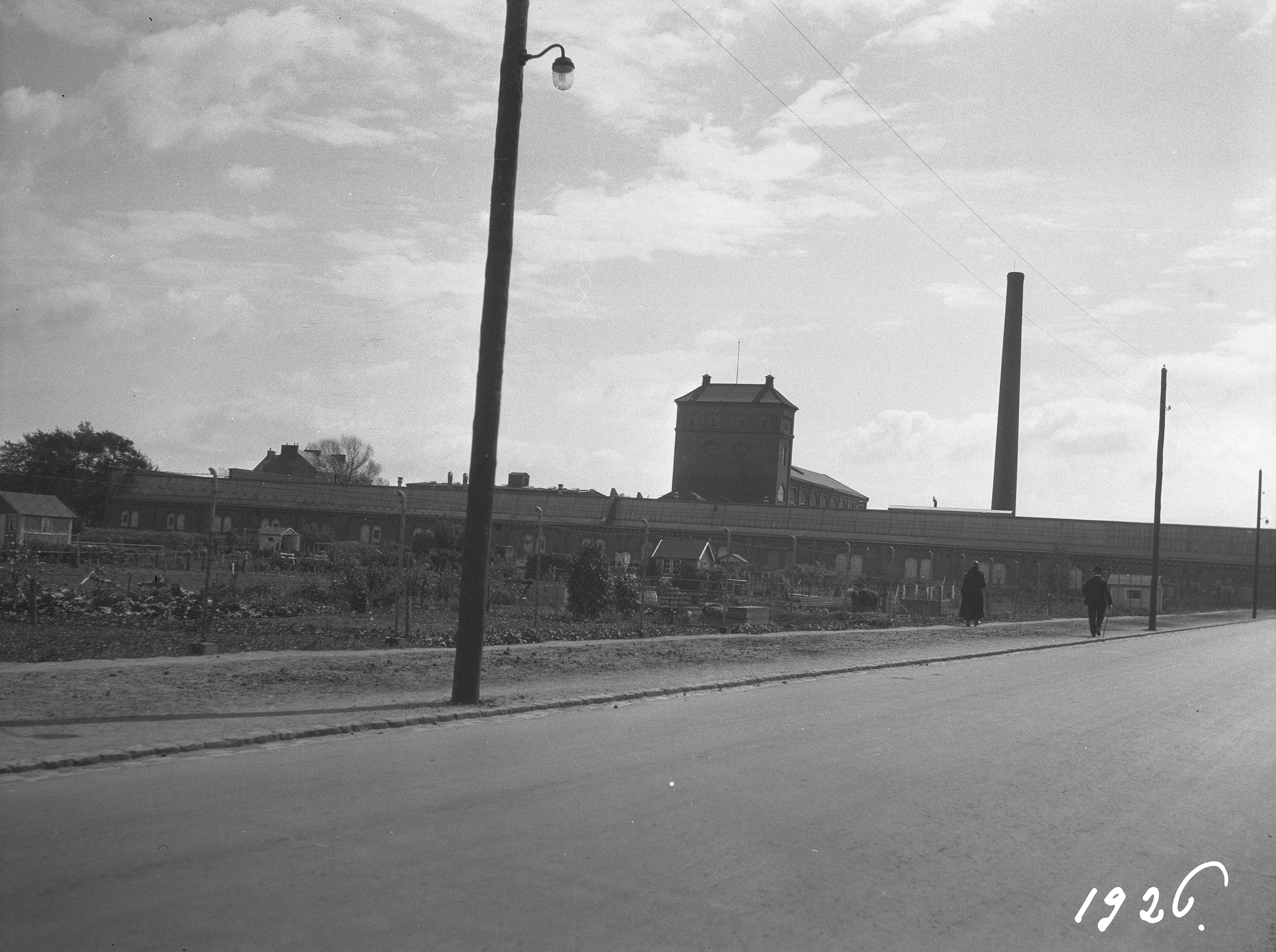 Manufakturaktiebolaget, exteriör. Koloniträdgårdar i förgrunden