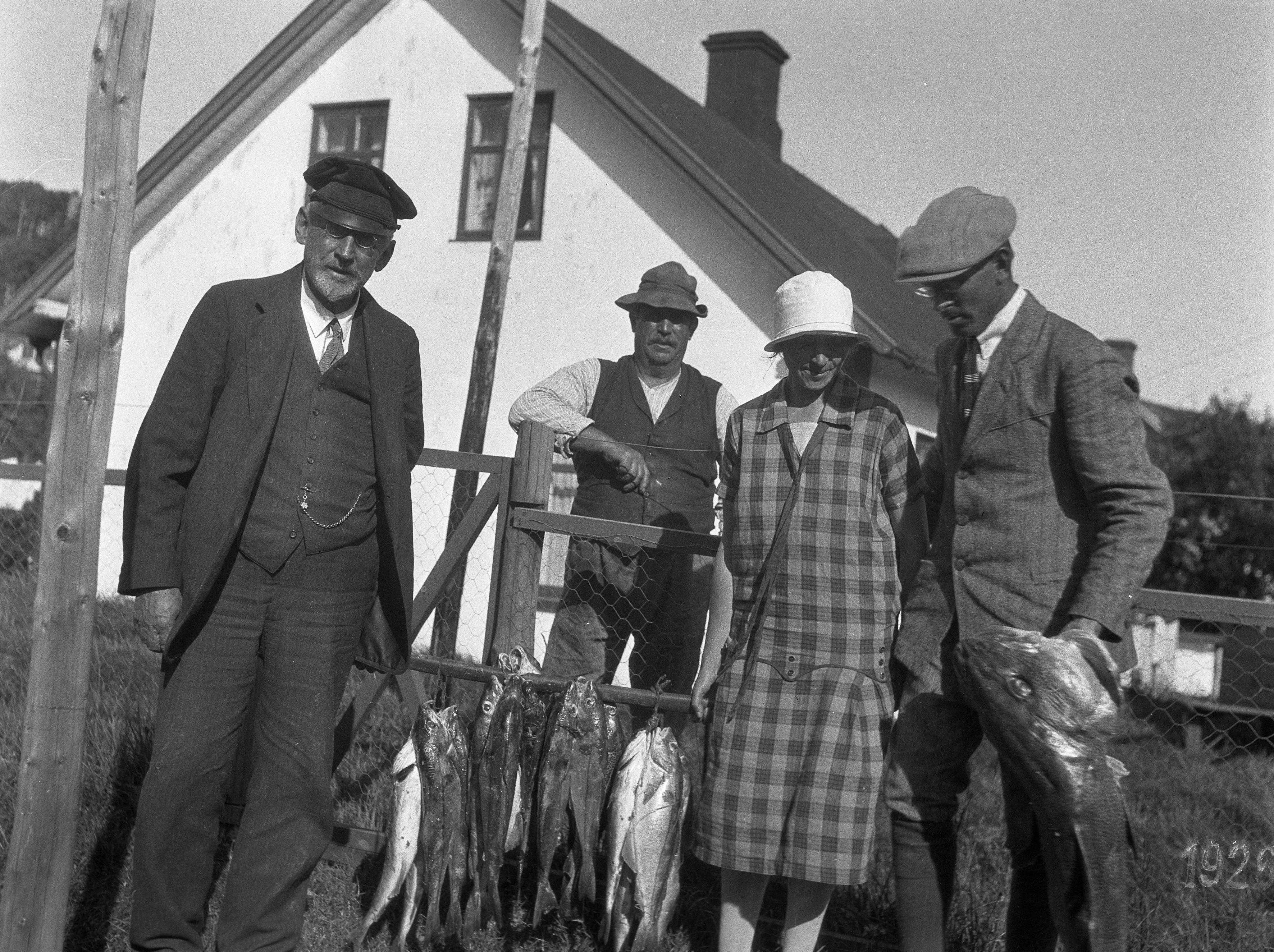 Framför huset: Harald, Einar, Clara. Fiskefångst: 60 kg kolja och 14 kg torsk