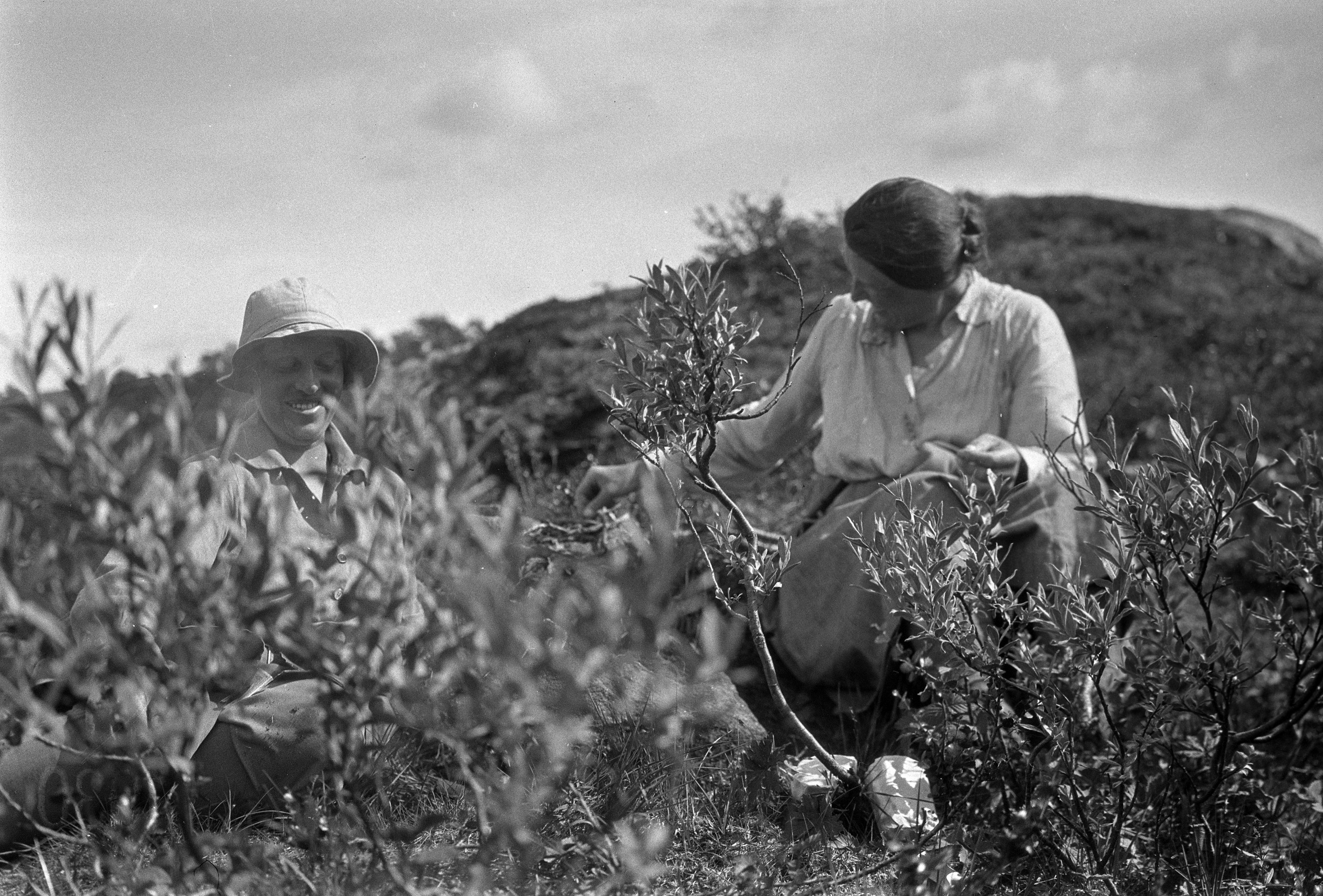 Ellen Bager och en kvinna plockar blåbär