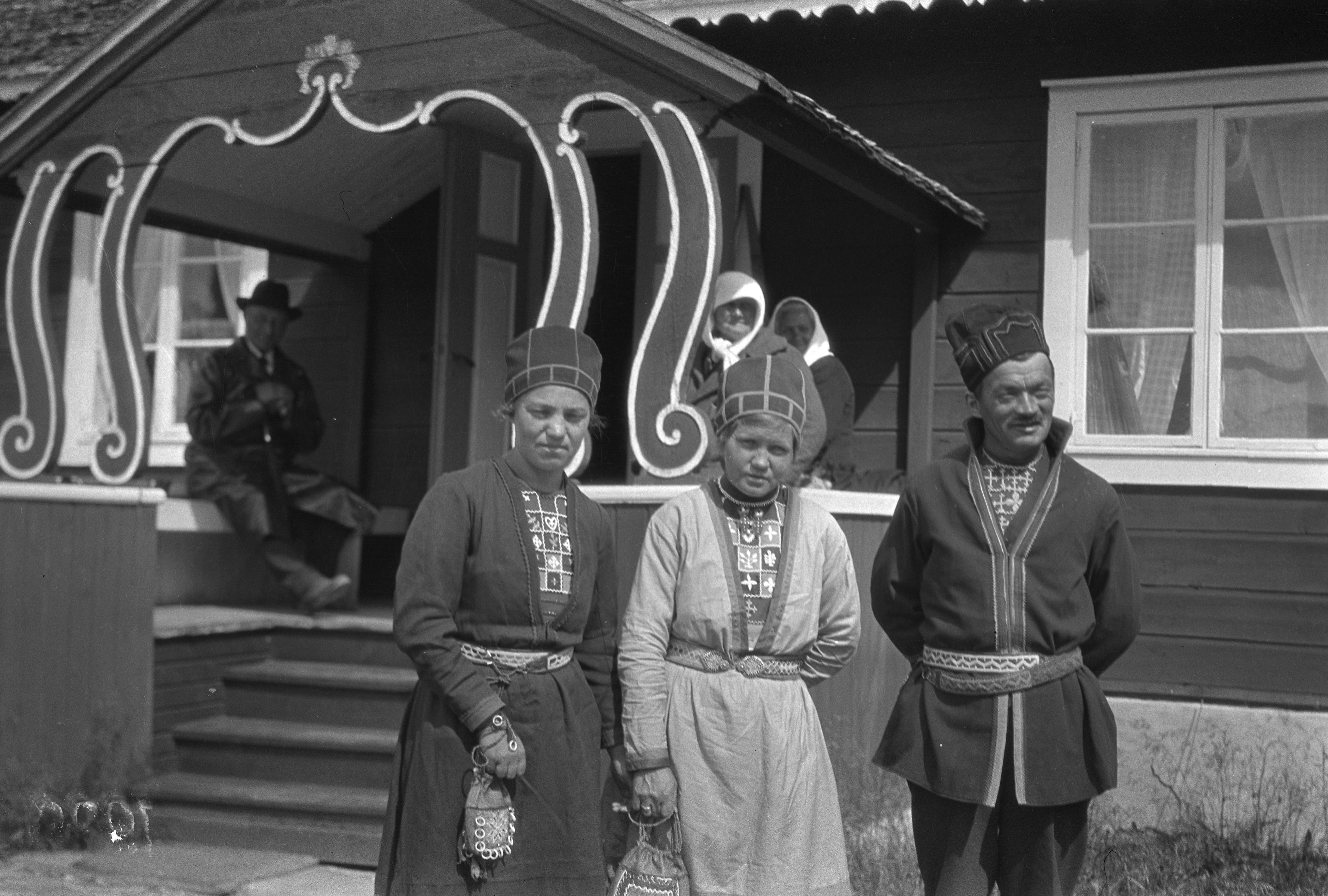En man och två kvinnor i samedräkter vid Ugglebohuset