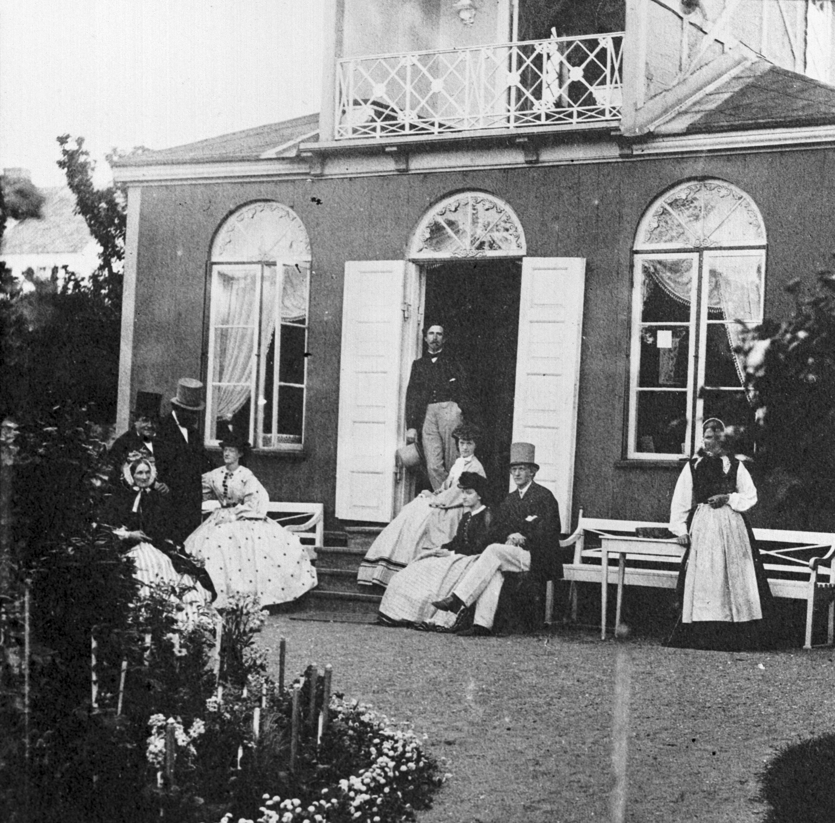 - Trädgårdspaviljong i Åbergska trädgården. Personerna äro från vänster: handlanden Nils Åberg, sittande framför honom hans hustru Christine Åberg, född Kock, vidare doktorn sedermera fältläkaren August Falck och hans hustru Charlotte Falck, född Åberg, i dörren löjtnanten sedemera ryttmästaren Mauritz Richter, sittande på trappan hans hustru Augusta Richter, född Åberg, bredvid henne mademoiselle Ida Flensburg och hennes trolovade herr Rudolf Åberg, längst till höger trädgårdskvinnan Silja. Denna trädgård tillhörde tomten nummer 760 i kvater 58 Generalens hage, vilken tomts olika delar handlanden Nils Åberg tillhandlat sig åren 1842, 1851 och 1854. Vid bouppteckningen efter hans hustru den 11 April 1877 erhöllo hans 3 barn, sonen Rudolf samt döttrarna Augusta Richter och Charlotte Falck hälften av fastigheten, andra hälften innehades fortfarande av honom själv. August och Charlotte Falck förvärvade genom köpebrev den 26 April 1877 och bytesbrev den 5 Mars 1878 denna tomt av Nils och Rudolf Åberg samt Mauritz och Augusta Richter och erhöllo lagfart å samma den 5 Augusti 1878. Därefter lät doktor Falck å tomten vid Slottsgatan uppföra en vacker byggnad i s.k. Rosenborgsstil, till vilken ritningen uppgjorts av danske arkitekten C.F. Rasmussen. Fotot är taget 1864.