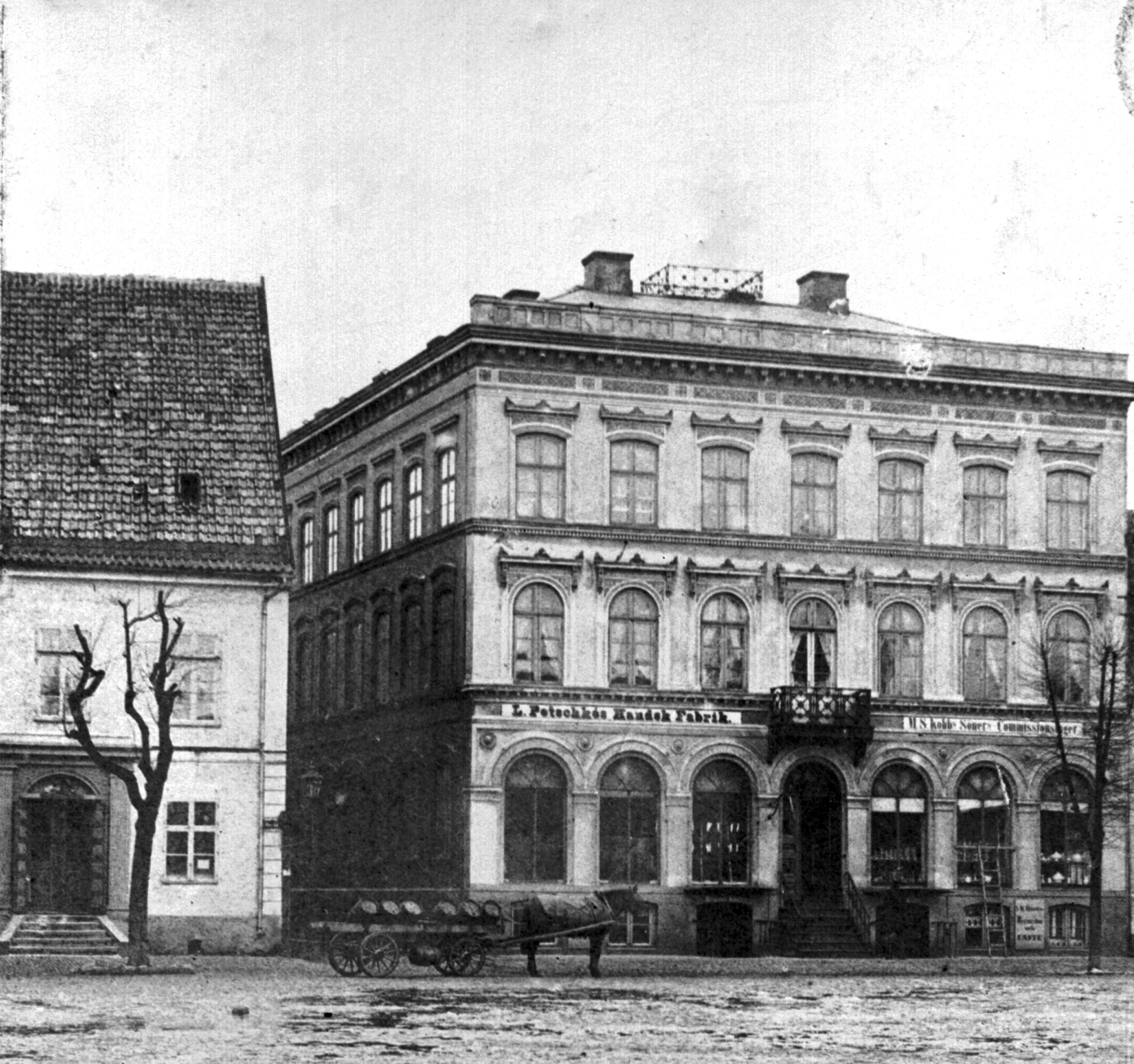 Handskfabrikör Petschke lät uppföra huset 1854, på tomt 511 och 512 i kvarteret nr. 40 Frans Suell. Vid 1860-talets gatuadress"reform" fick huset adress Stortorget 7.Atatlas2024-09-11 19:49