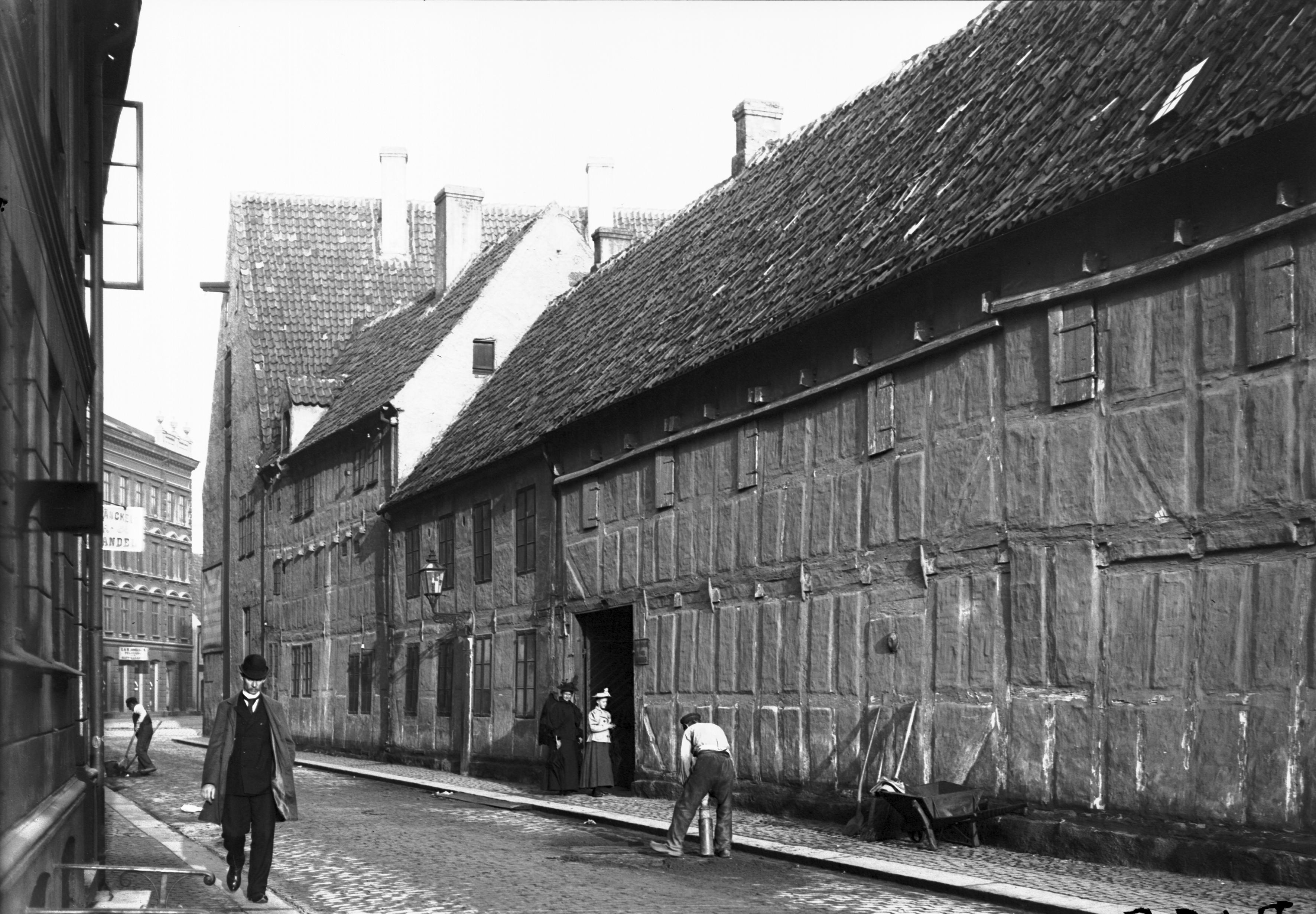 Korsvirkesbyggnader vid Baltzarsgatan tillhörande Hultmanska fastigheten vid Södergatan kvarter 48 Claus Mortensen, början av 1890-talet.