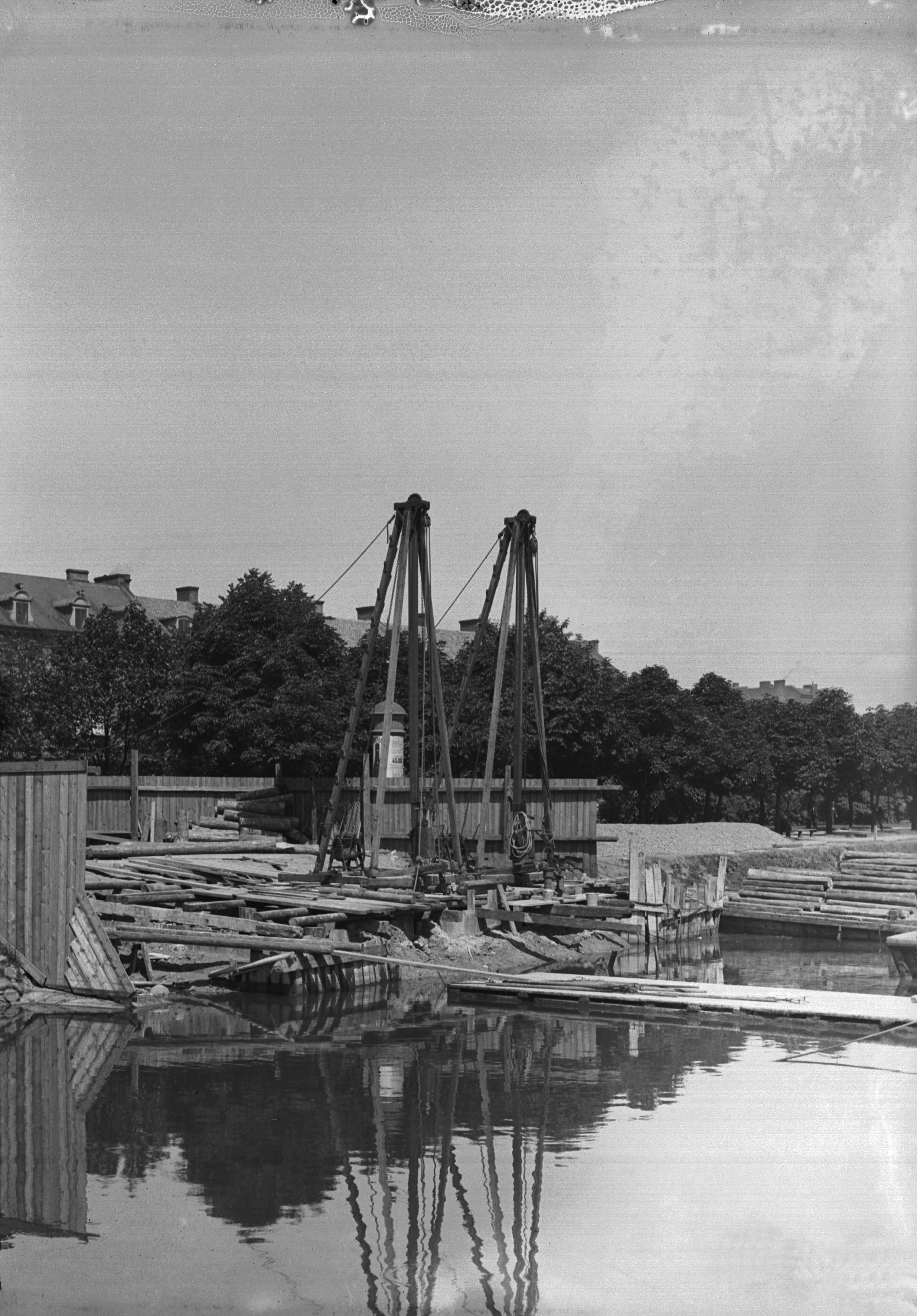 Pålkranar vid Amiralsbron under ombyggnad. 1899-1900.