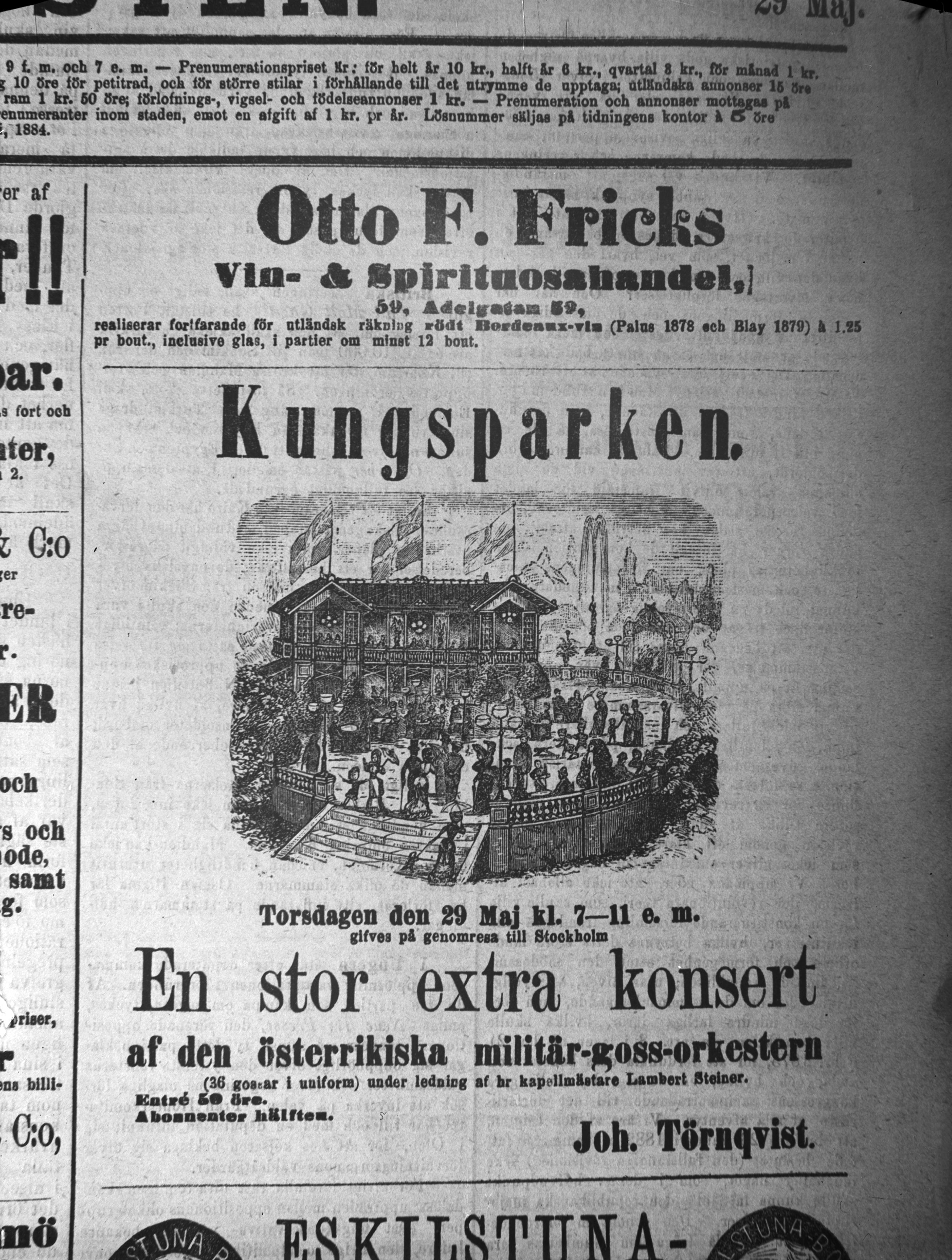 Annons i Sydsvenska Dagbladet om Kungsparken år 1884