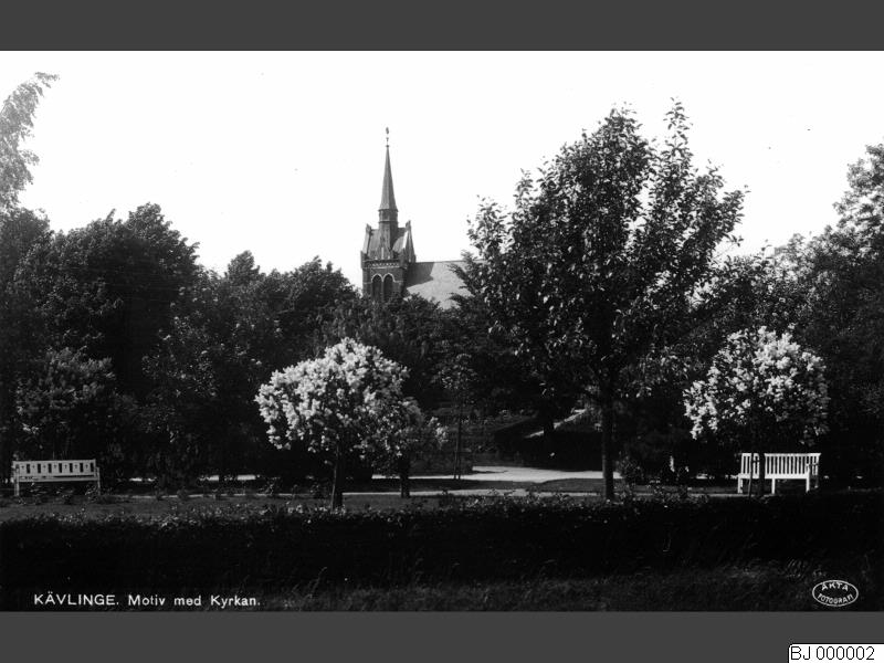 Kävlinge. Parkmotiv med Kävlinge nya kyrka i bakgrunden. Kyrkan av rött tegel i gotikimiterande stil är från år 1897.