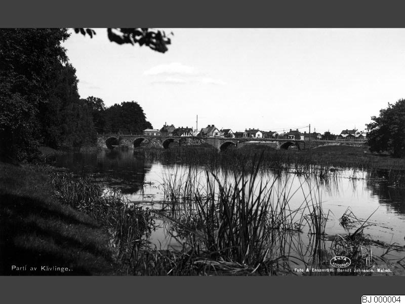 Kävlingeån med bebyggelse och en gammal stenbro i bakgrunden.