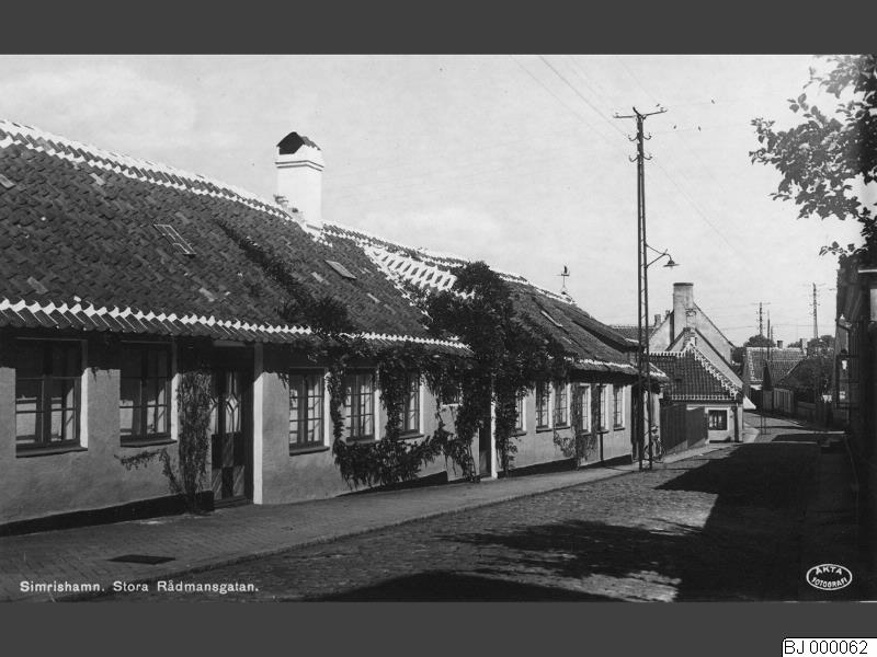 BJ 000062 :: stadsbebyggelse, bostadshus, vindflöjel, skorsten, cykel, stadsgata, gatubelysning, telefonledning