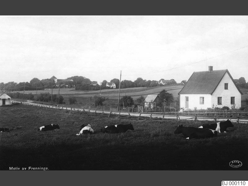 bybebyggelse; bondgård; väg; ko; mjölkko; kyrka; telefonledning; jordbruksbebyggelse