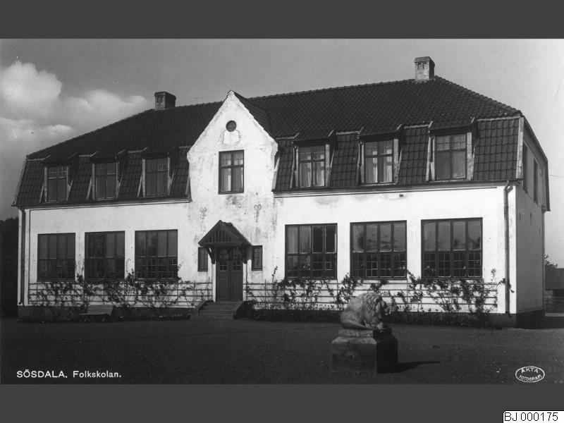 Sösdala. Folkskolan. Skulptur av ett lejon i förgrunden.