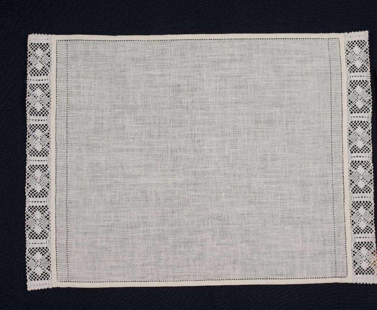 Spetsen monterad vid korsändarna av en tablett av vitt linne uppsydd med hålsömmar.