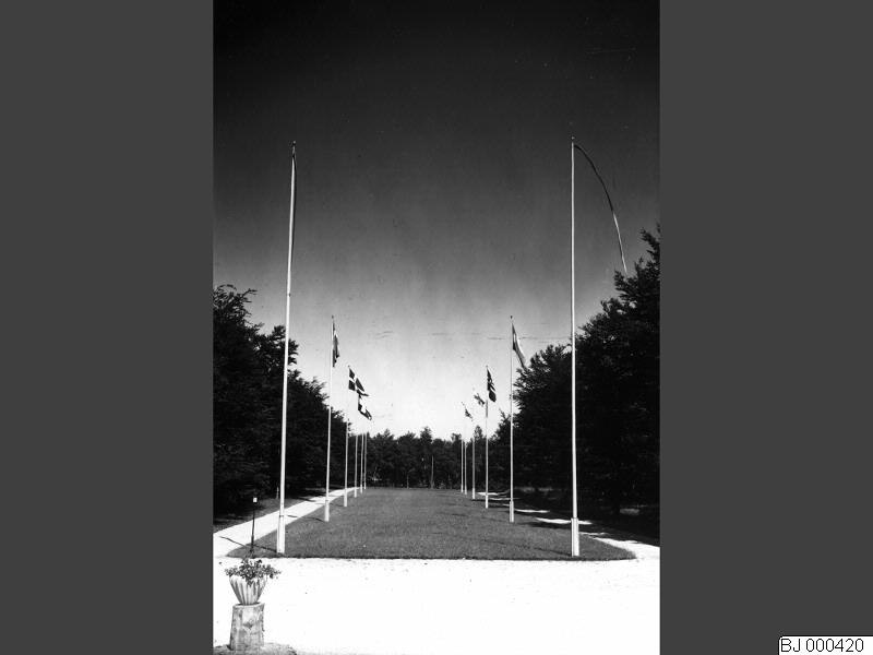 - Utsikt från hotellet, Bjärreds Saltsjöbad mot gård med flaggstänger.