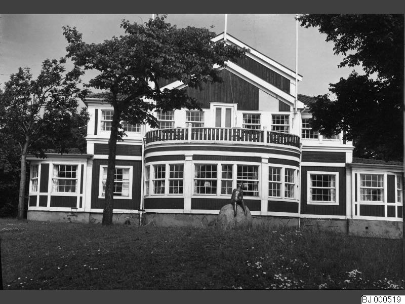 BJ 000519 :: skulptur, restaurang, flaggstång, träd