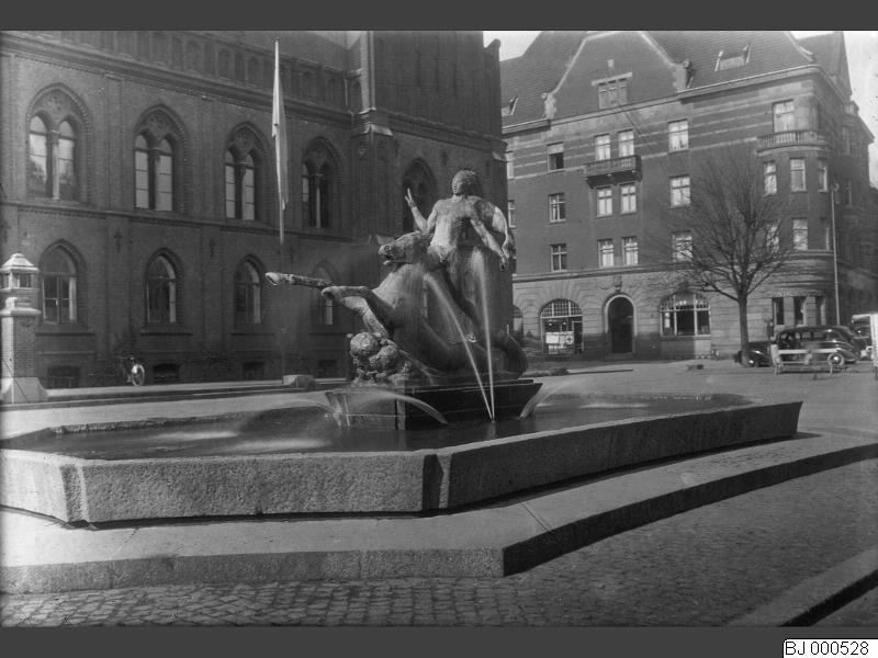 - Landskrona i maj 1944. Rådhustorget med Anders Olsons fontän Västanvind.