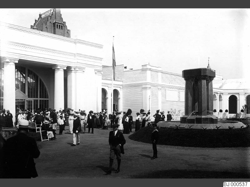 utställning; badhus; fontän; skulptur; bänk; flaggstång; nationalflagga; konung; kunglighet