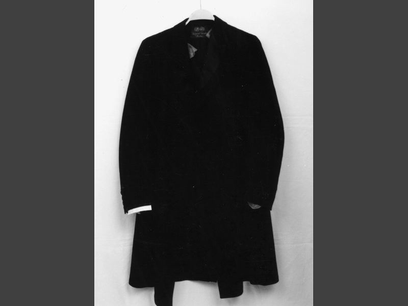 - Bonjour av svart kläde. Liggande krage, garnerad på slagen med siden. Avskuren i midjan. Överklädda knappar. Dubbelknäppt med 3 knappar i knappraderna (6 knappar). Foder av svart rips, ärmfoder av bomullstyg randat i vitt och svart.