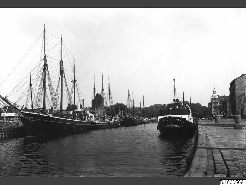 Segelfartyg och färja i Landskrona hamn. I bakgrunden badhuset i Badhusparken.