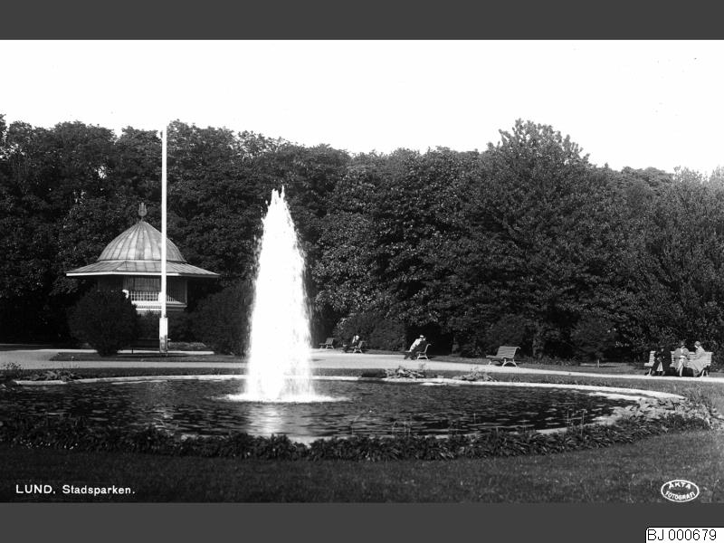 BJ 000679 :: park, musik, fontän, flaggstång, bänk