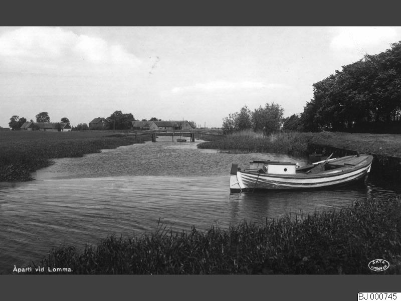 BJ 000745 :: vattendrag, fiskebåt, bondgård, halmtak