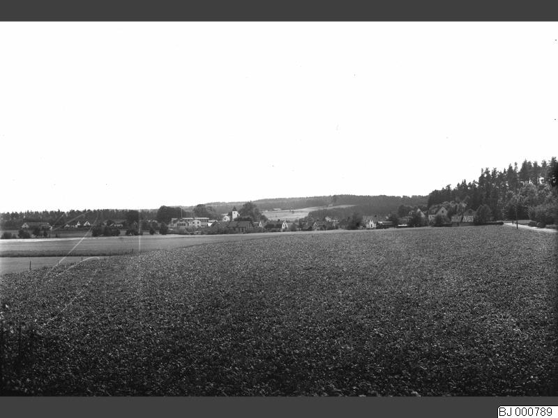 BJ 000789 :: kyrka, tätortsbebyggelse, skogsbygd, telefonledning, väg, bostadshus, folkskola