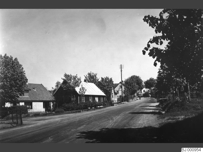 BJ 000954 :: telefonledning, väg, buss, bostadshus, staket, träd