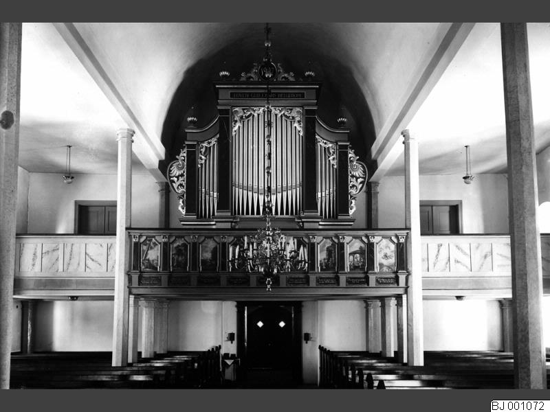 BJ 001072 :: kyrkorgel, orgelläktare, kyrkointeriör, kyrkbänk, ljuskrona, kyrka