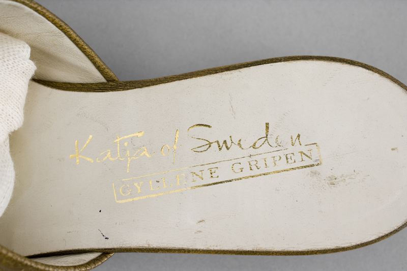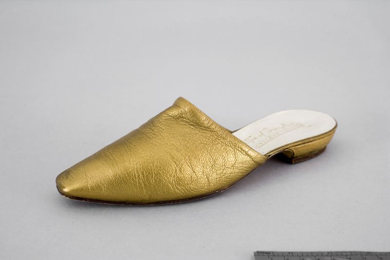 Tofflor, 1 par av guldskinn,mellansula, innersula och foder av vitt skinn.låg klädd klack, lädersula. Spetsig avskuren tå. Stl. 6 ½.