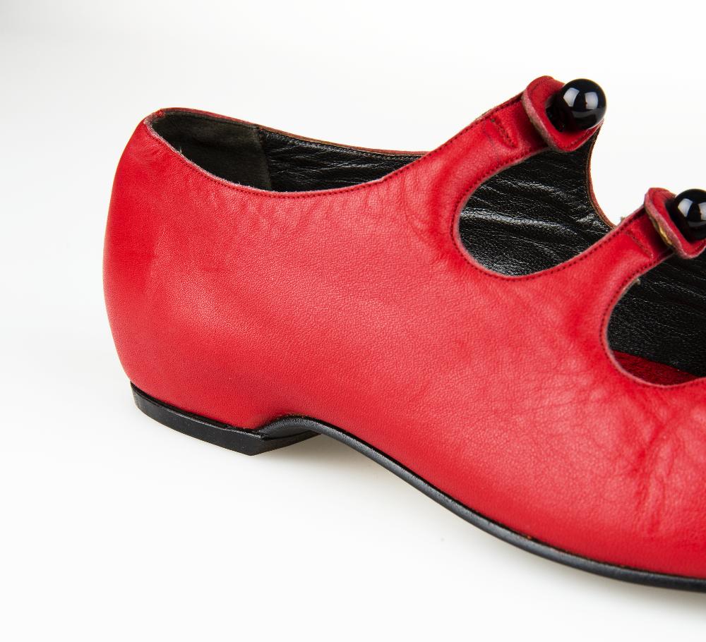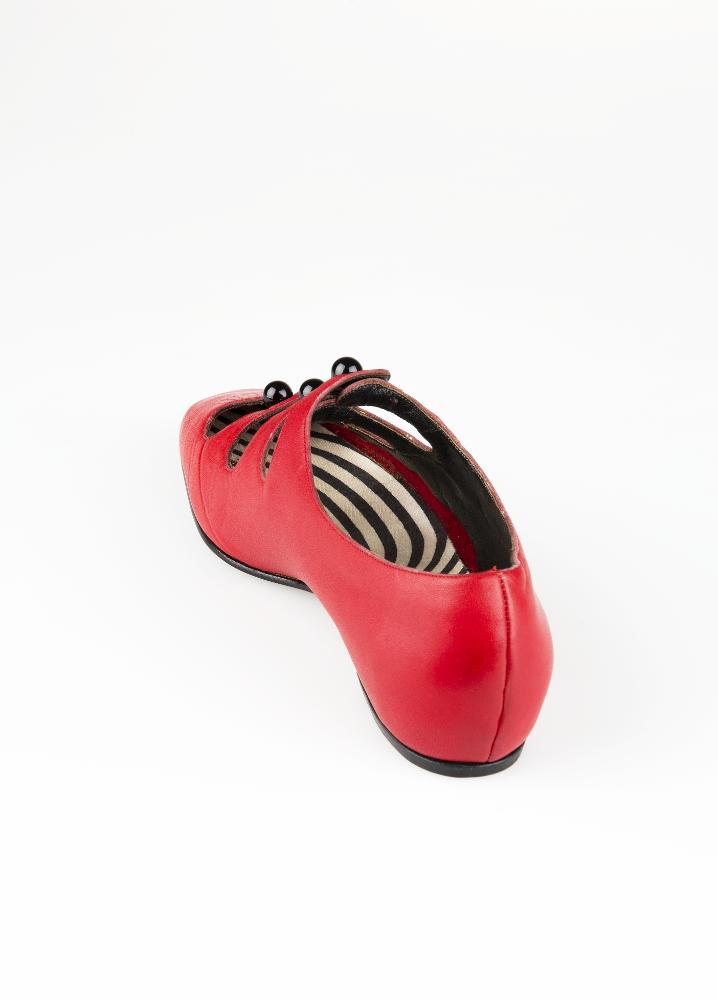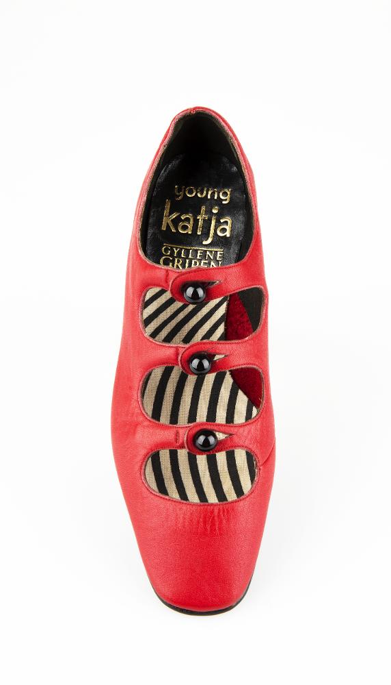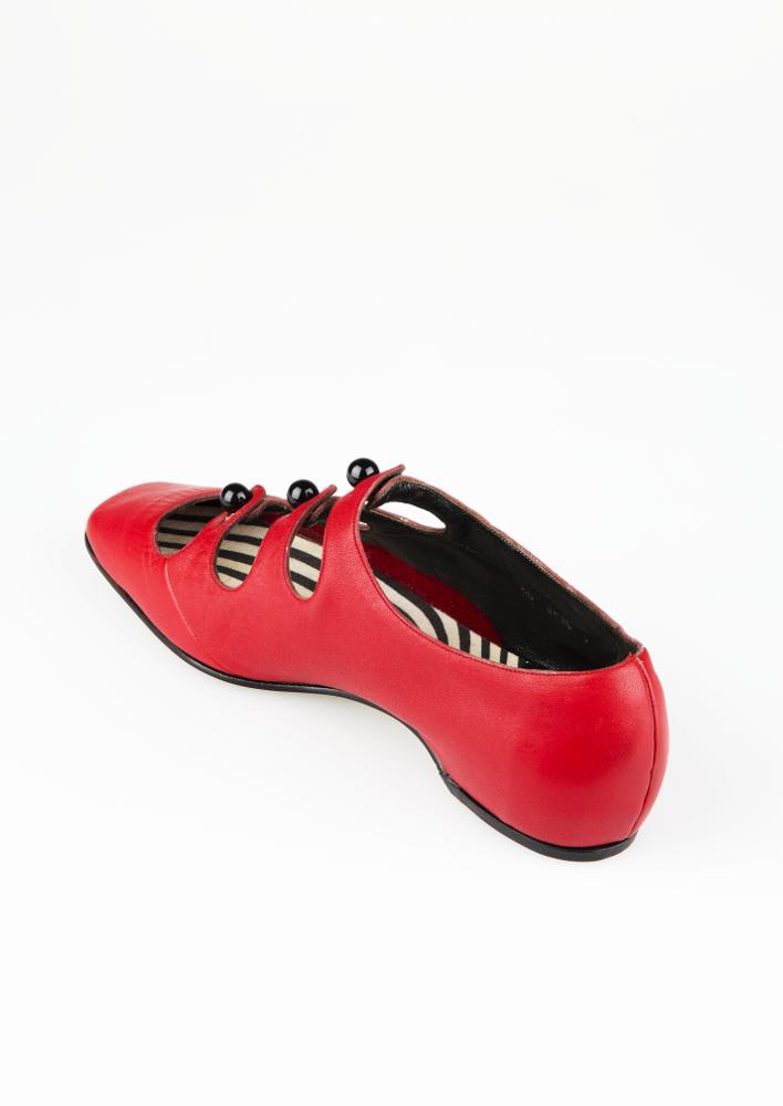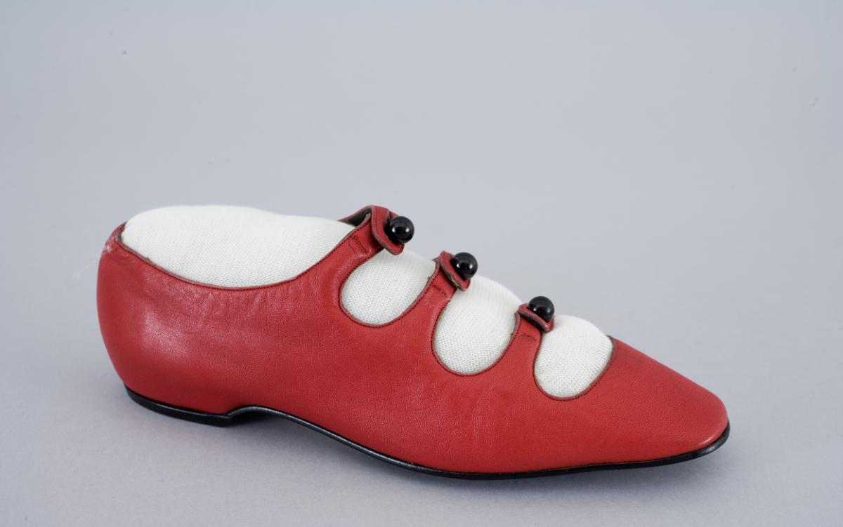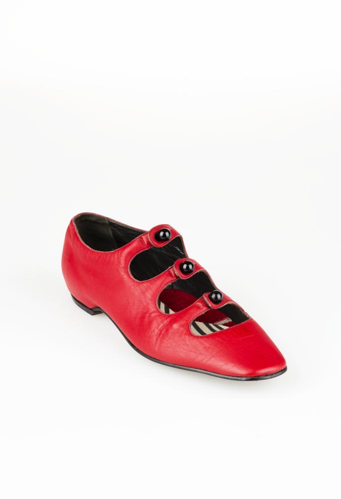 En sleifsko av rött getskinn, tre sleifar, inbyggd överklädd klack.