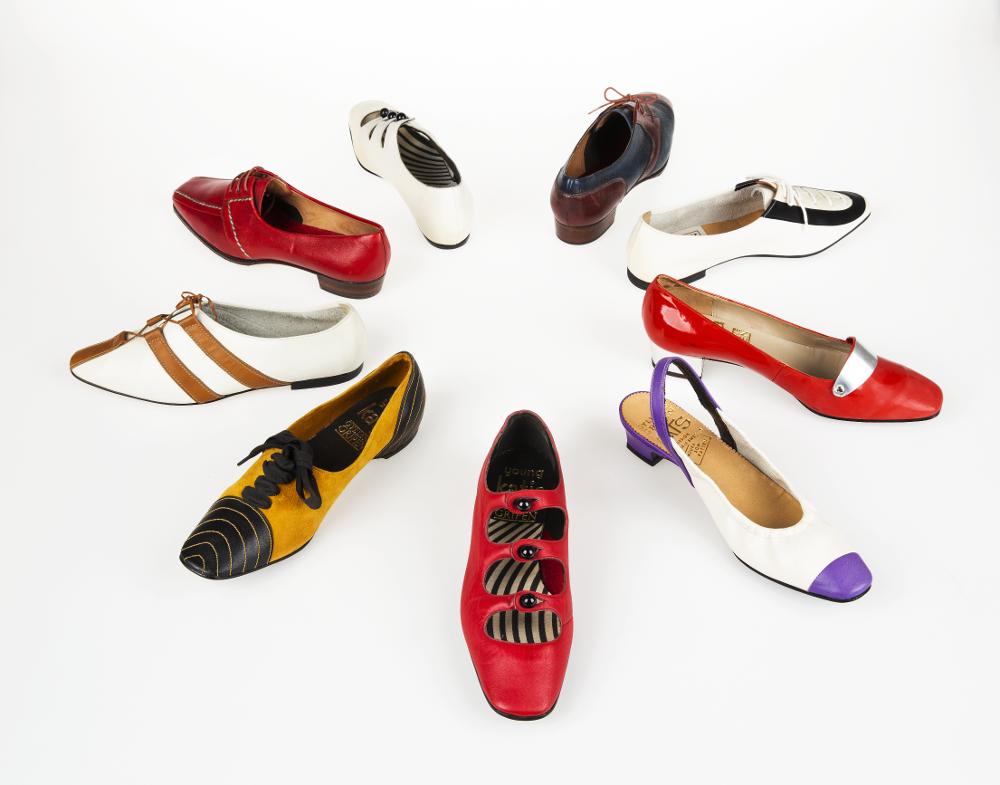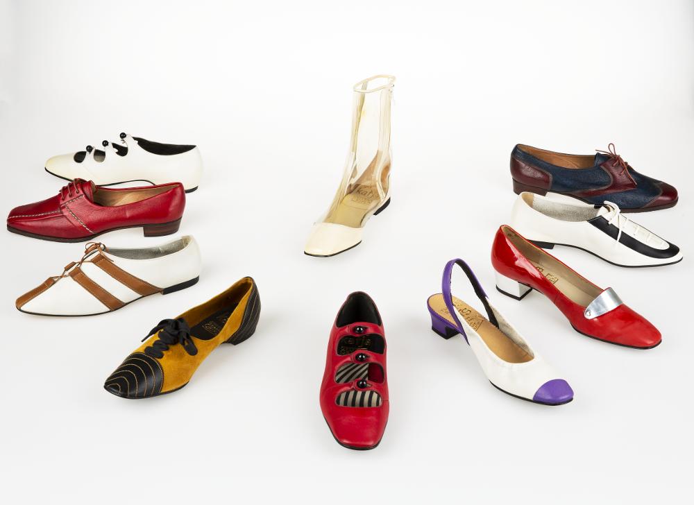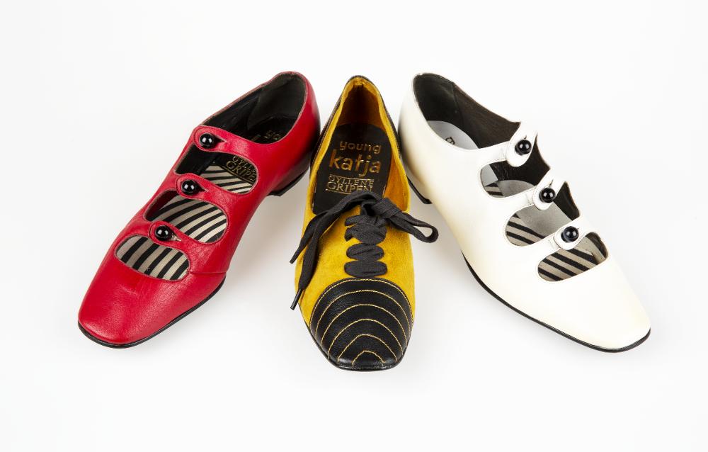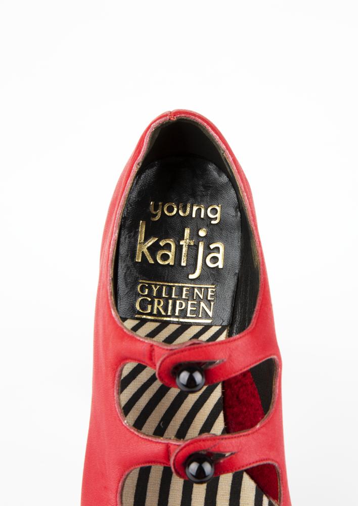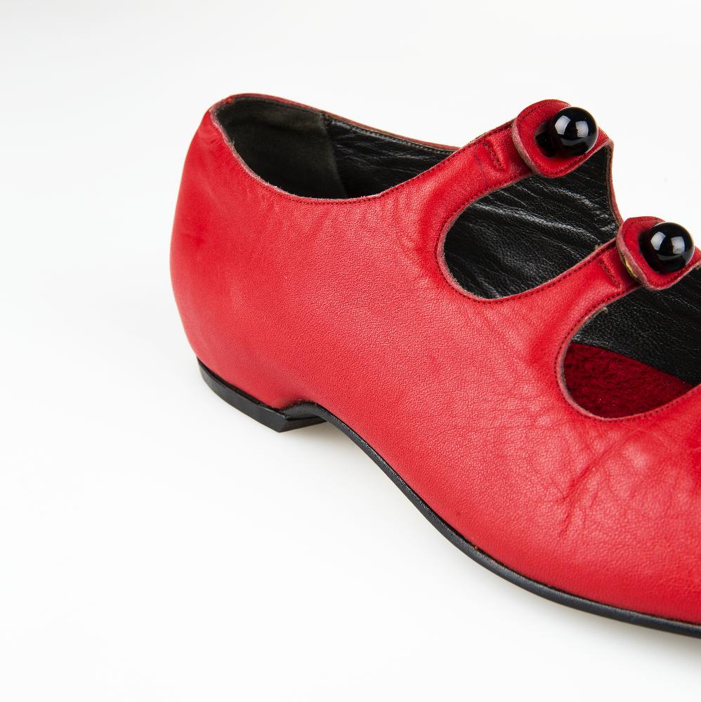 En sleifsko av rött getskinn, tre sleifar, inbyggd överklädd klack.