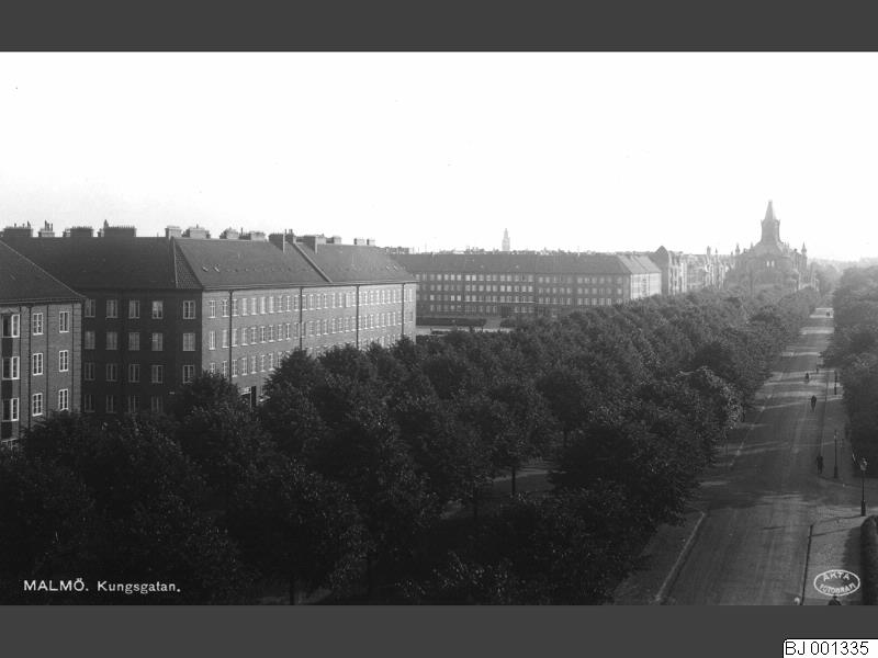 BJ 001335 :: stadsbebyggelse, stadsgata, park, kyrka, flerbostadshus, burspråk, skorsten, gatubelysning