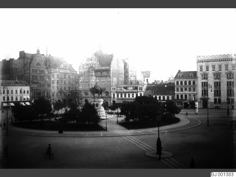 torg; stadsbebyggelse; flerbostadshus; apotek; staty; gatubelysning; cykel