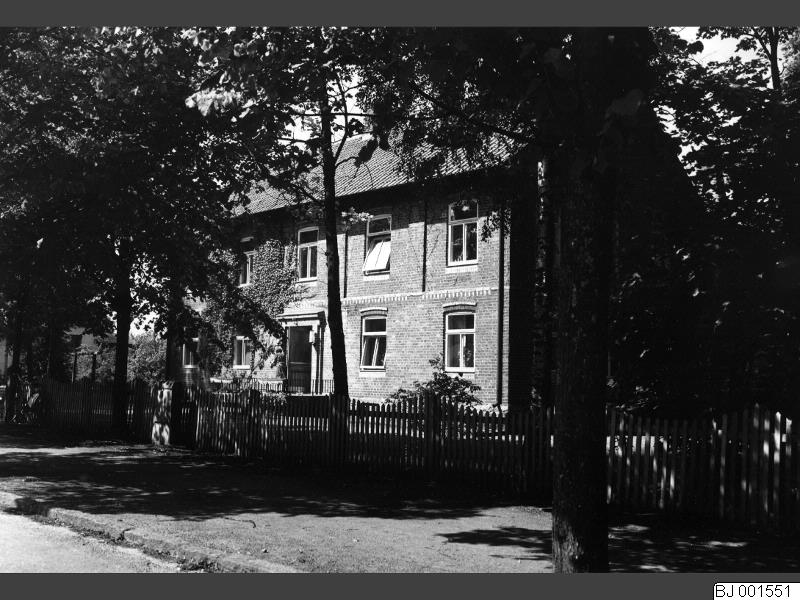 Skolbyggnad (?). Träd i förgrunden