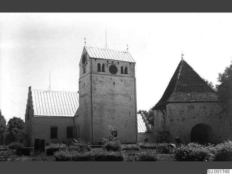 Fjälkinge kyrka. I förgrunden den gamla portbyggnaden.