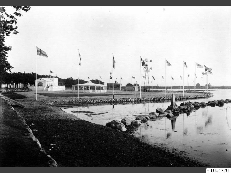 BJ 001770 :: utställning, havskust, strand, flaggstång, nationalflagga